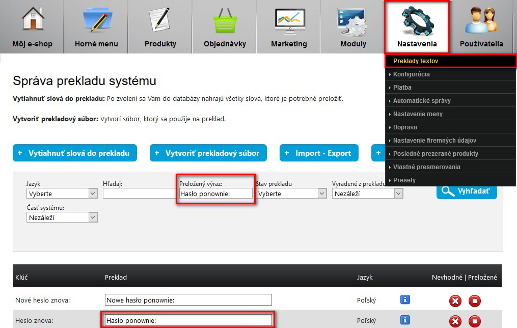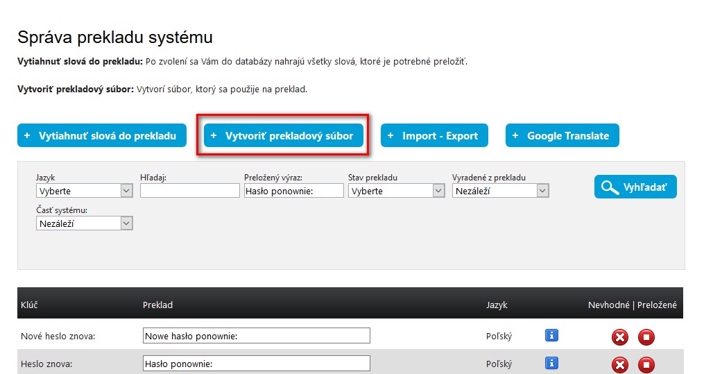 Po tom, ako budete mať upravené všetky texty musíte kliknúť na: "Vytvoriť prekladový súbor" čím aplikujete preklady. Vytvoriť prekladový súbor netreba klikať za každým jedným prekladom, stačí to kliknúť na konci.