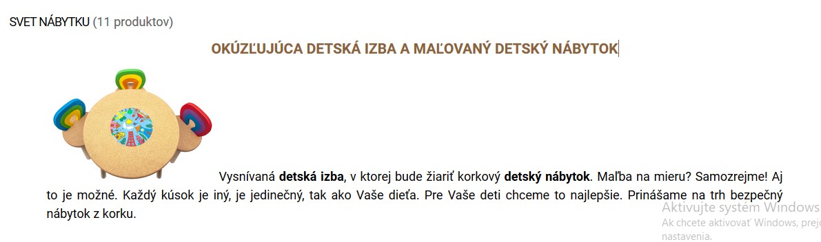 Zvážil by som názov kategórie: Svet detské nábytku. V tágu H1 (názov kategórie nám absentuje slovo detsky, ale aspoň detské )