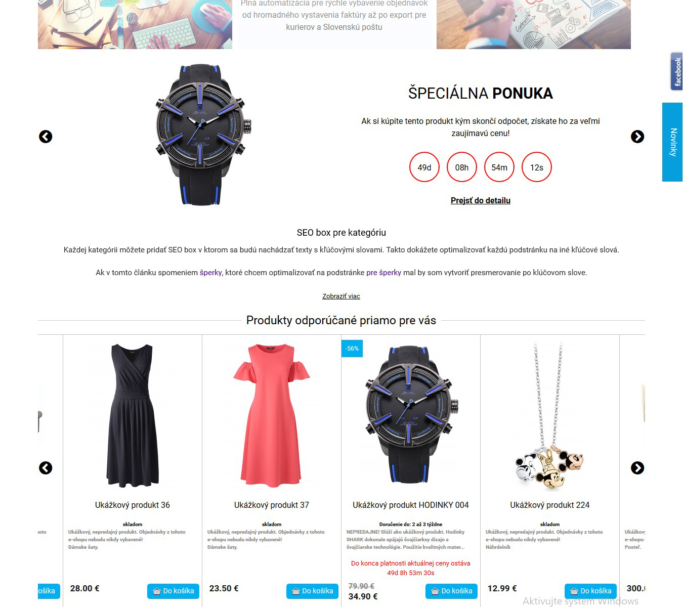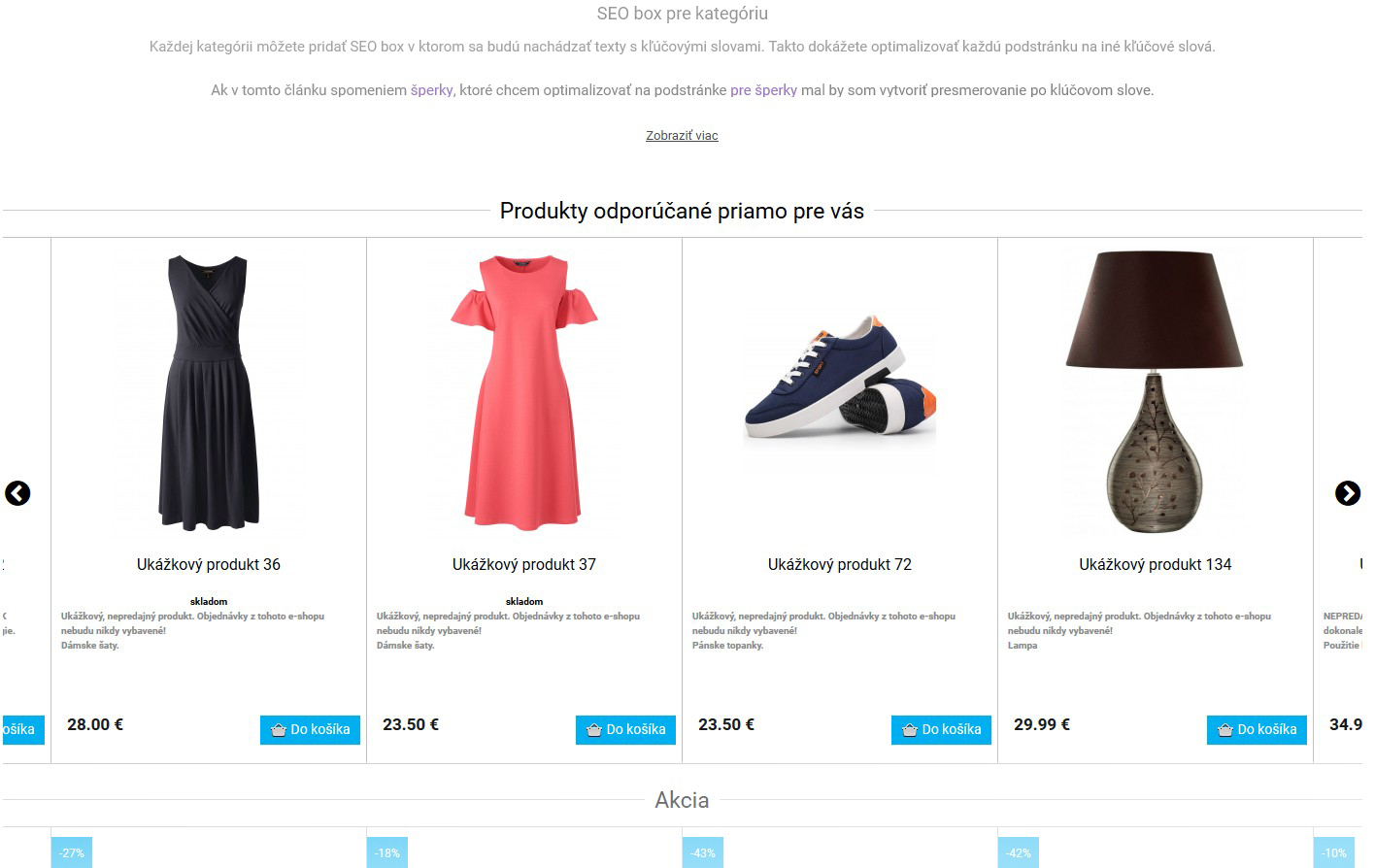 Slovenský zákazník veľmi rád nakupuje akciový tovar alebo využíva výpredaje na získanie lepšej ceny. Je tu aj skupina, ktorá si potrpí na novinkách. Každému produktu viete nastaviť „visačku“, kde pri prechádzaní katalógu každý jasne vidí, že sa jedná o zaujímavý tovar. Pre zvýšenie pohodlia si môžete nastaviť aj dátum, kedy sa toto označenie vypne.