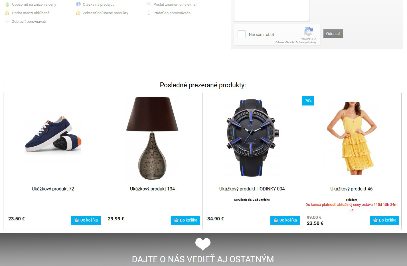 V každom detaile produktu sa nachádza možnosť jeho odporučenia známemu prostredníctvom e-mailu. Je to výhodné v prípade, že používateľ u Vás nájde tovar, o ktorom vie, že ho niekto z jeho okolia hľadá.