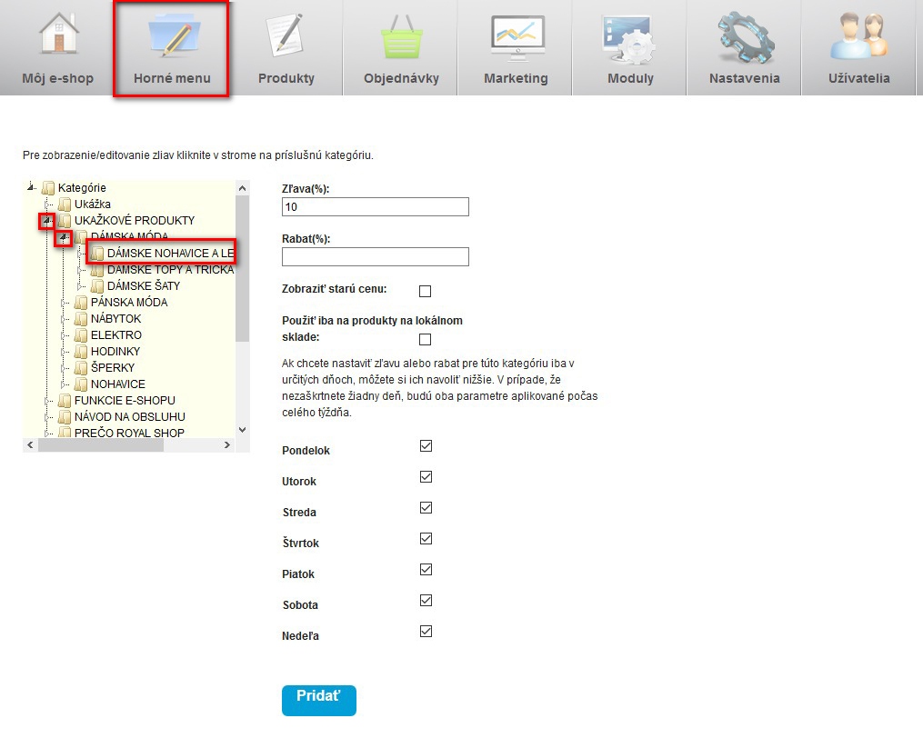 Nastavenie zľavy a rabatu pre kategórie a podkategórie