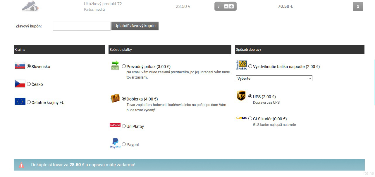 Keďže si pre košík dokážete definovať aj krajiny doručenia, samozrejmosťou je možnosť odlišnej ceny dopravy pri každej z nich. Tú môžete zadať buď jednotnú, alebo ju prispôsobiť na základe ceny nákupu či váhy objednaného tovaru.