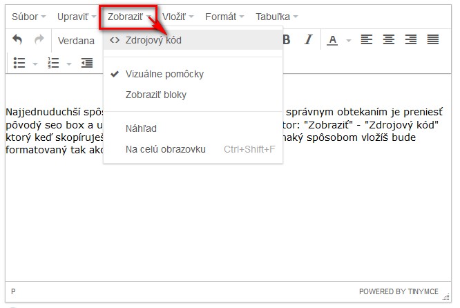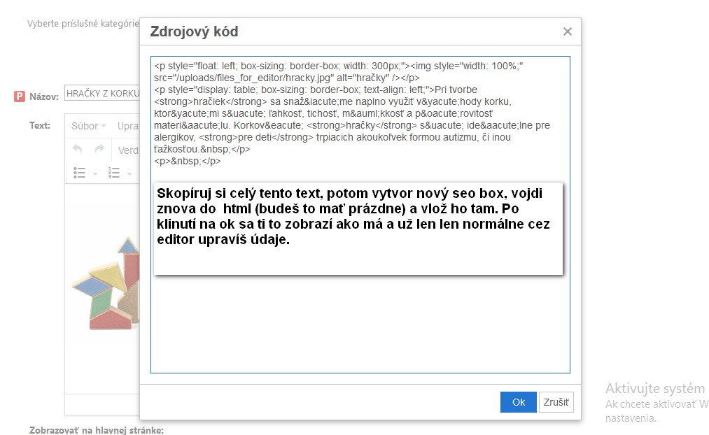 Aby si nemusela stále lisť do správneho seo boxu, html kód si môžeš skopírovať z tade a len ho vložiť do nového cez html:
