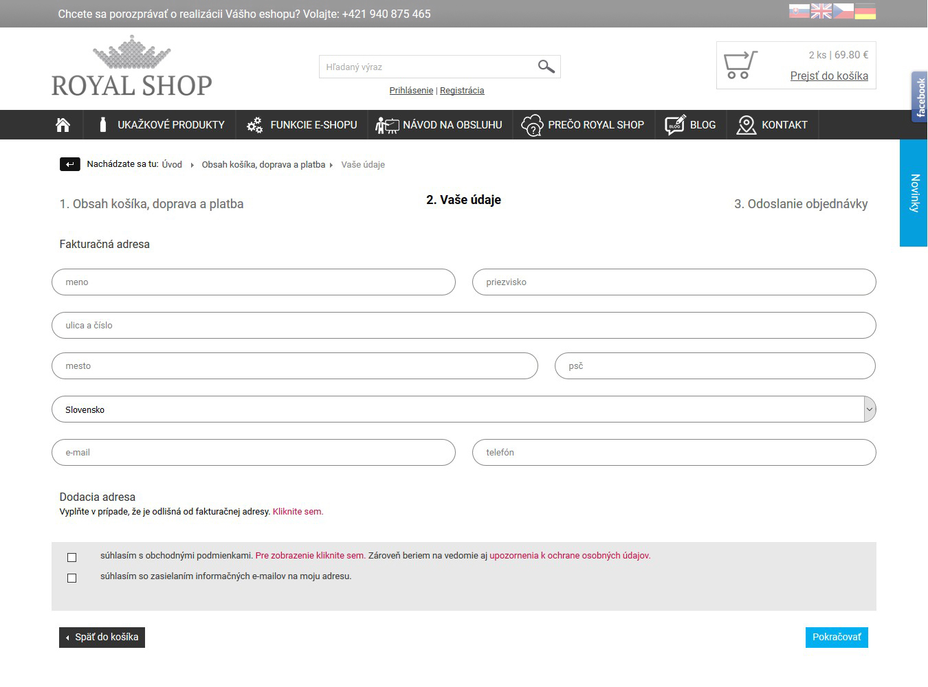 Vyplnenie fakturačnej a dodacej adresy je taktiež umiestnené na samostatnej podstránke.