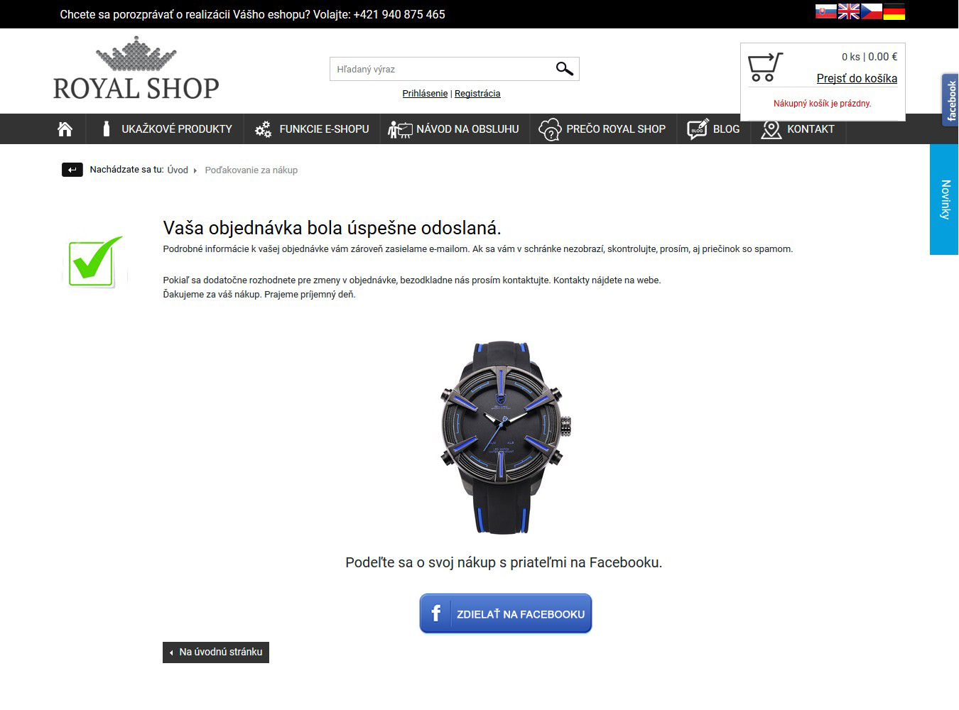 Nasleduje poďakovanie za odoslanie objednávky, pričom je zákazníkovi odoslaný aj e-mail s potvrdením jej prijatia.