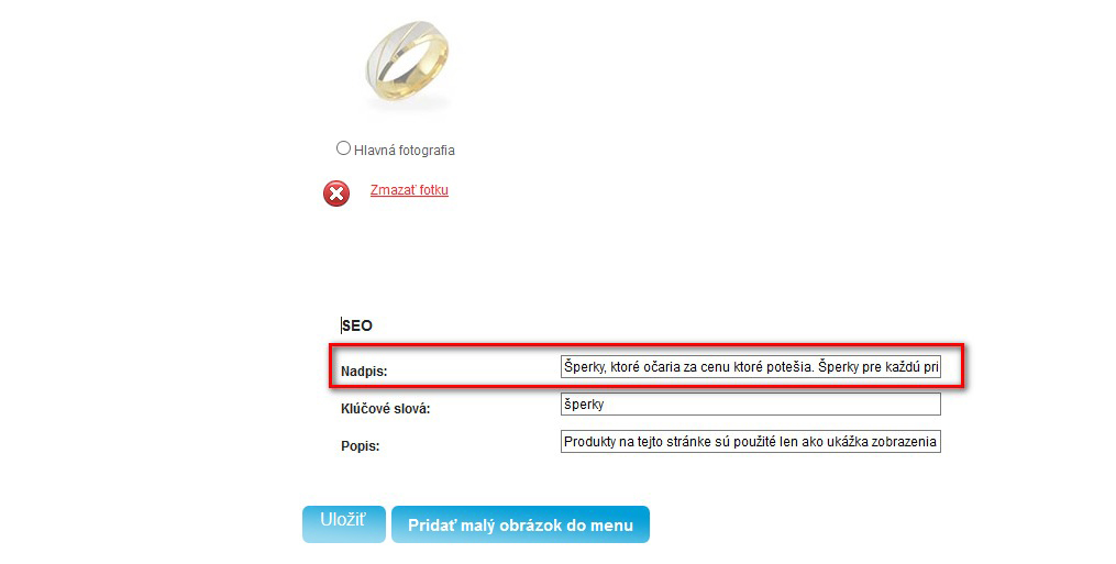 Každej stránke, kategórii, produktu, článku či blogu je možné nastaviť titulok, popis či kľúčové slová, ktoré sú veľmi dôležité. Pokiaľ ich však nevyplníte, automaticky sa čerpajú z názvu či popisu danej položky.