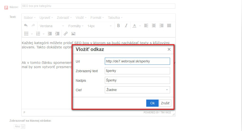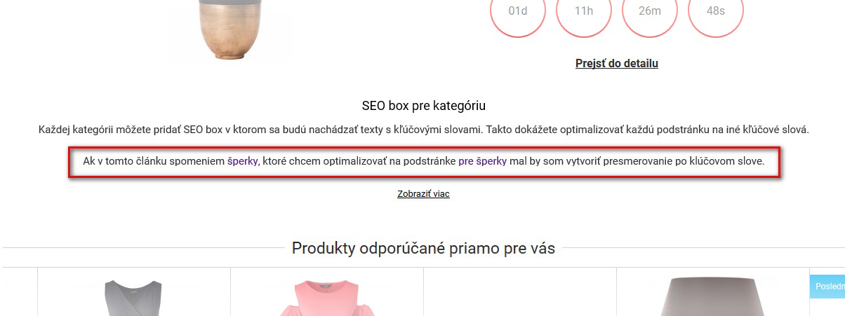 V rámci SEO boxov, ktoré sa dajú vytvárať pre všetky kategórie cez administráciu e-shopu, môžete každej z nich pridať dodatočné texty a obrázky, čo Vám dopomôže k lepšiemu umiestneniu.