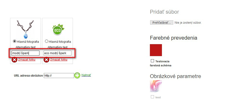 V rámci detailu produktu máte možnosť nahrať fotky, ktoré by mali byť pomenované podľa klúčových slov. My ich názvy zachováme a ponúkneme Vám možnosť vyplniť pre vyhľadávače veľmi obľúbený alternatívny text.