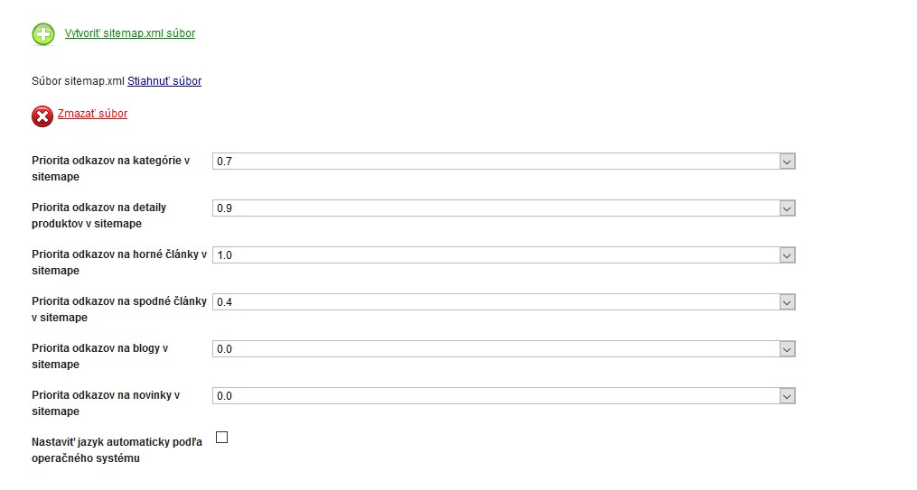 Systém má vytvorený vlastný sitemap generátor, pomocou ktorého viete jedným poklepaním myši vygenerovať aktuálny sitemap.xml súbor. Vyhľadávač sa vďaka nemu lepšie orientuje na Vašom e-shope. Môžete nastaviť prioritu informácií tak, aby vedel lepšie odlíšiť podstatné odkazy od tých menej podstatných.