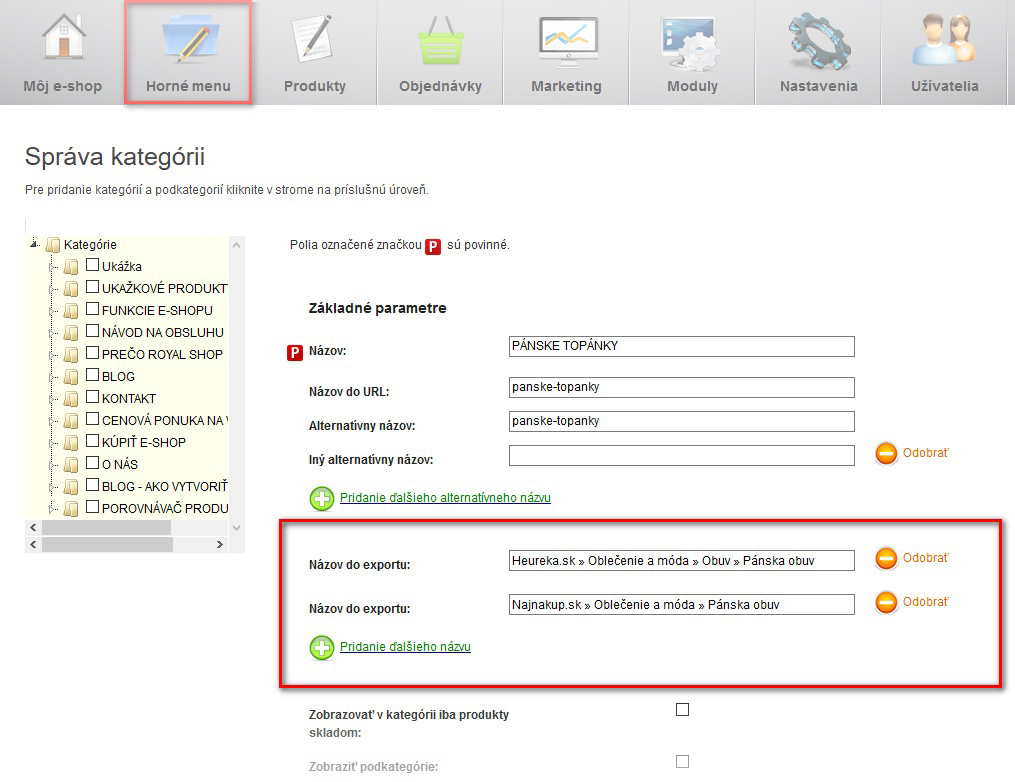Možnosť vytvárať alternatívne názvy kategórií pre porovnávače cien