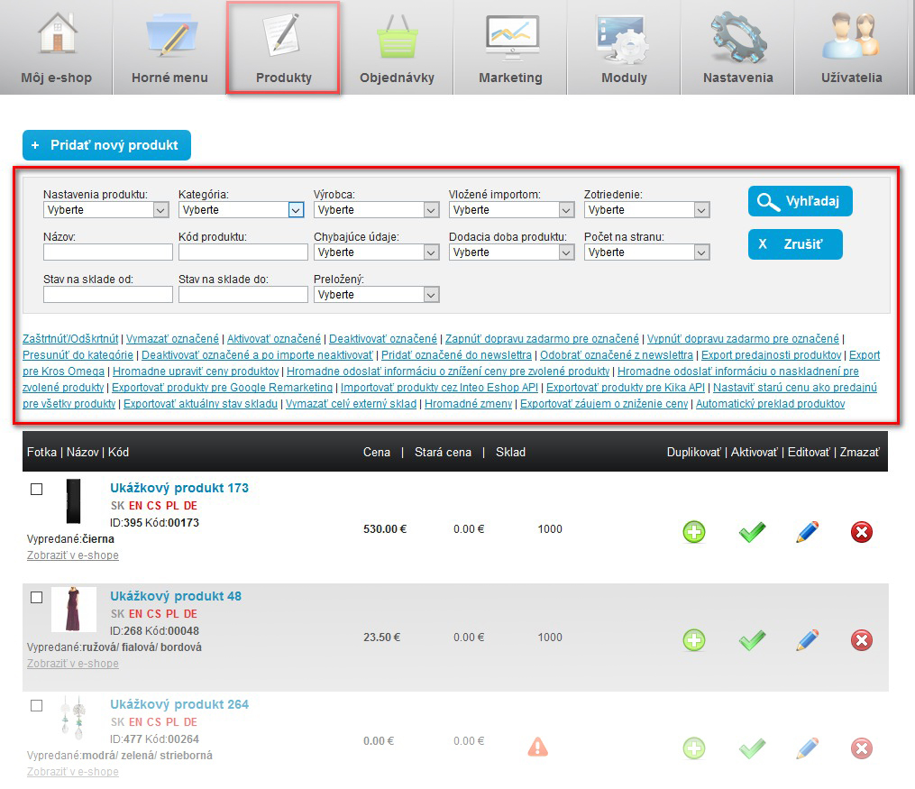 Vďaka tejto funkcii dokážete napr. hromadne preradiť produkty do inej kategórie alebo ich zmazať či deaktivovať. Taktiež môžete manipulovať s ich cenou nahor/nadol v peňažnej mene/percentách. Dá sa to zaujímavo využívať na to, aby vyhľadávače na Vašich stránkach videli neustále zmeny. To totiž hodnotia veľmi pozitívne a získavate tak cenné body v SEO.