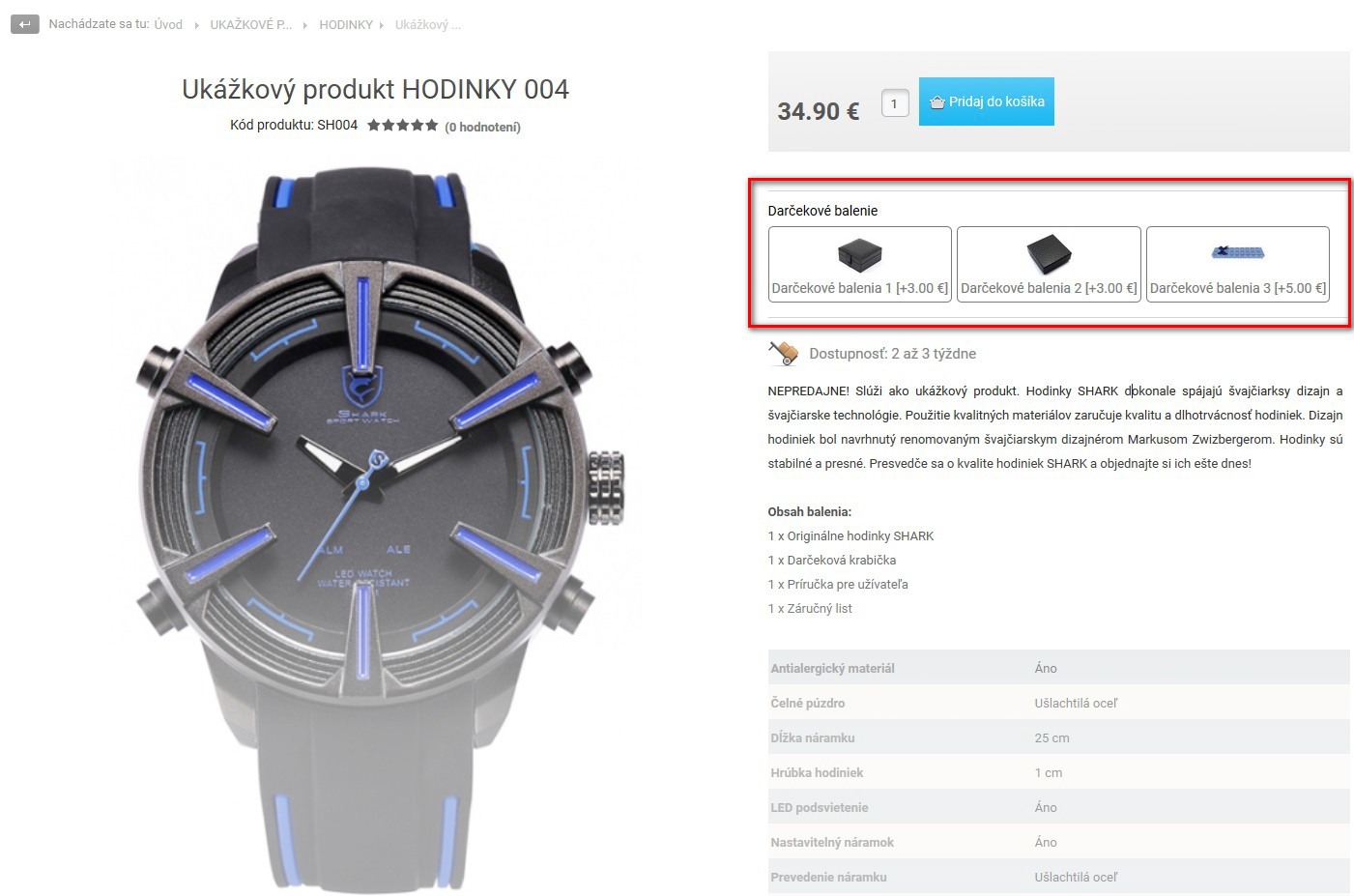 Ak ku produktu ponúkate napr. darčekové balenie alebo voliteľné úpravy, doplatkové parametre sú to, čo hľadáte. Použiteľné sú vo forme selektovníkov alebo radio boxov s obrázkami. Cena sa po zvolení niektorého z nich automaticky aktualizuje.