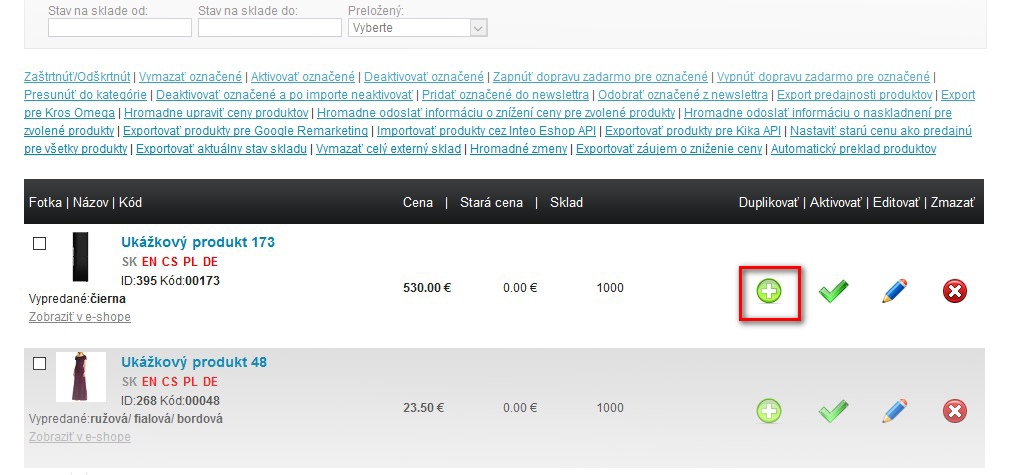 Niekedy sa stane, že potrebujete pridať nový produkt, ktorý sa však od už existujúceho líši iba v drobnostiach. Táto funkcia Vám jediným poklepaním myši vytvorí duplikát a ušetrí tak množstvo času.