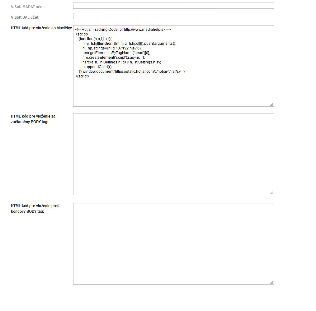 Možnosť vložiť vlastné JS kódy pre prepojenie s externými systémami.
