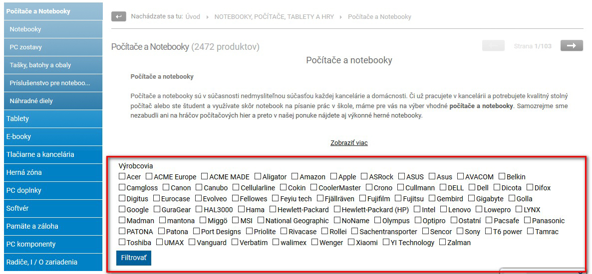 Možnosť vytvárať rôzne filtre pre kategórie