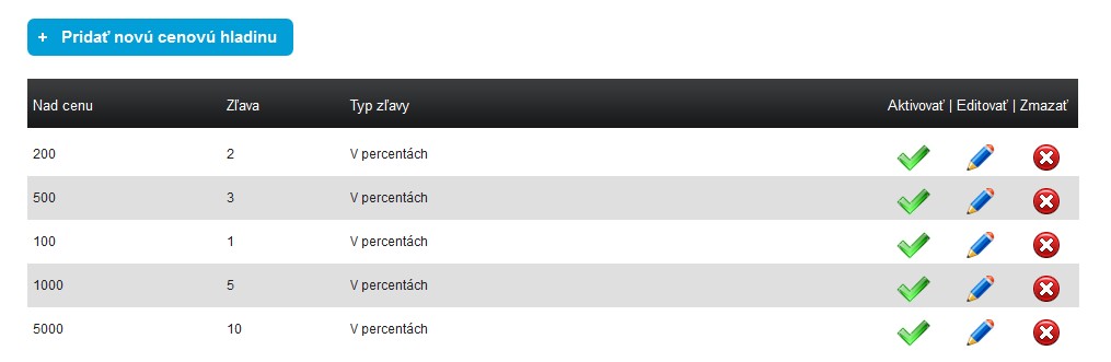 Slúžia ako motivácia zákazníka k väčšiemu nákupu. Viete si nastaviť lubovoľný počet cenových hladín typu „Nakúp nad 100 € a získaš 3 % zľavu“, „Nakúp nad 500 € a získaš až 10 % zľavu.“.