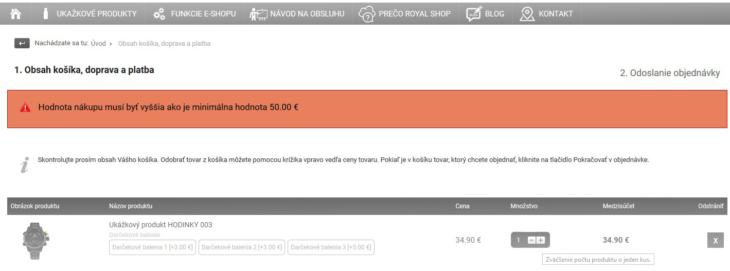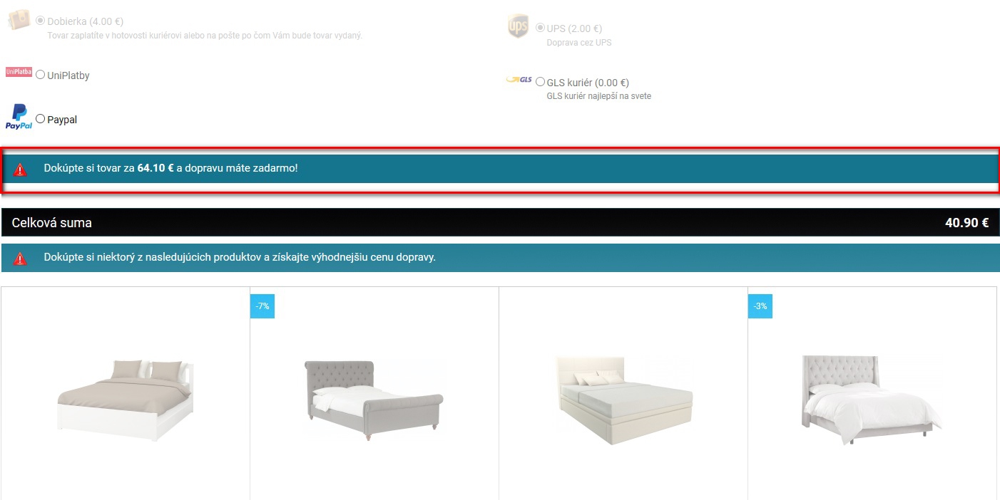 Táto funkcia košíka motivuje zákazníkov po zvolení platby a dopravy k dokúpeniu tovaru vo zvyškovej hodnote pre získanie bezplatného doručenia. Slovenský zákazník rád ušetrí, preto môže byť aj veľmi účinná.