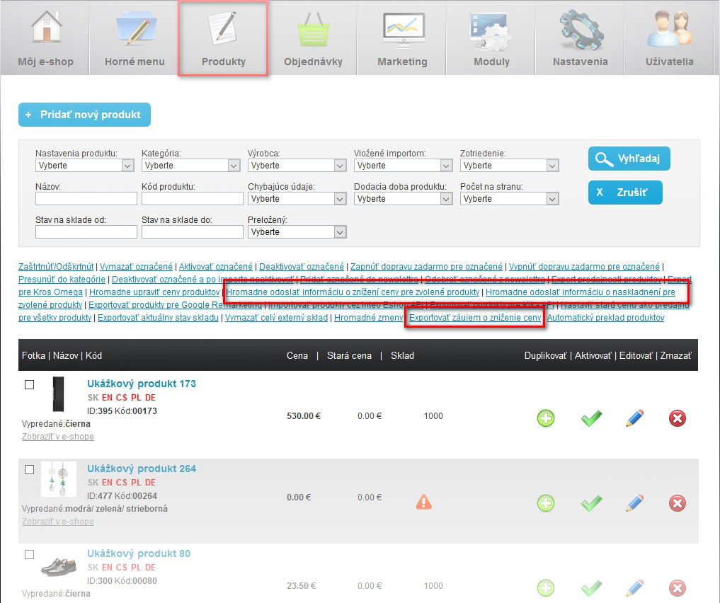 Upozornenie na zníženie ceny a naskladnenie produktu